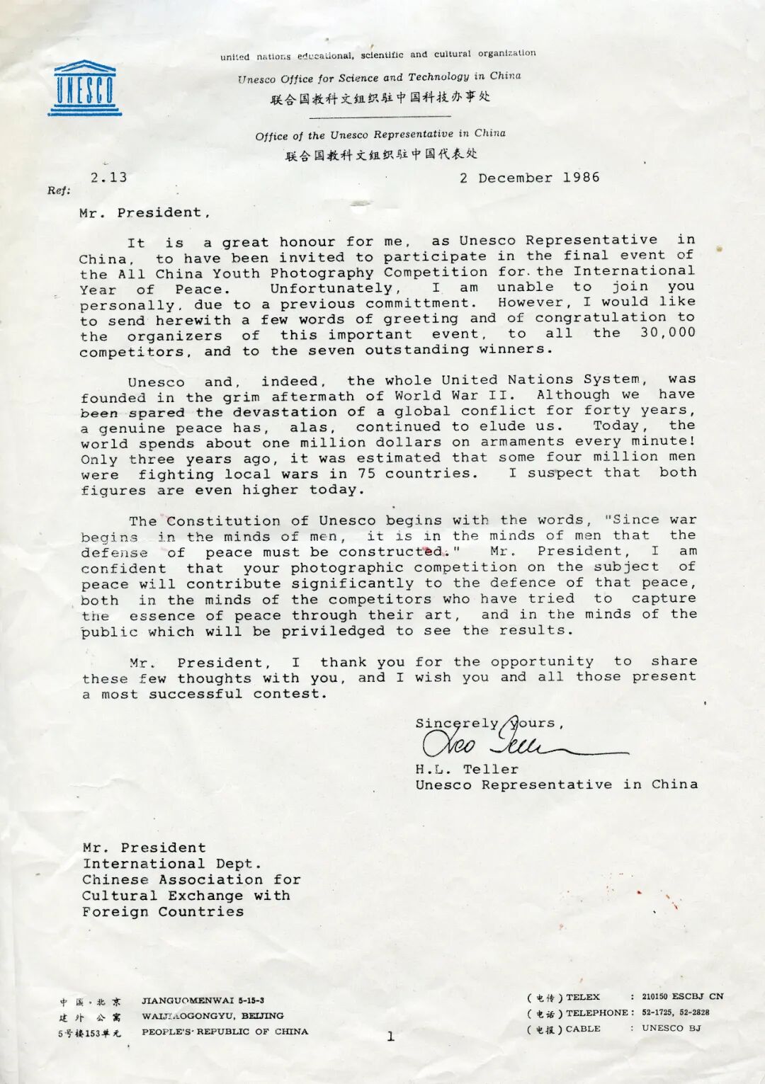 1986年12月2日,联合国教科文组织驻中国总干事H•L•泰勒博士的贺电