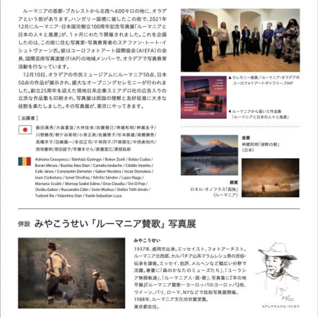 Hiltopia Art Squarea Gallery in Tokyo, Japan hosted on Wednesday 05 October 2022, 18:00 local time (12:00 RO time) the opening of the exhibition of photographic artists from Japan and Romania entitled "People and landscapes from Romania and Japan" dedicated to the anniversary of 100 years of diplomacy between Romania and Japan. The exhibition organized under the patronage of the Embassy of Romania in Japan by the International Association "Euro Photo Art" (AIEFA), in partnership with the Japanese Photographic Society (PSJ) and the Japan-Romania Society, with the support of Summit Agro Romania, part of the global Japanese corporation Sumitomo, includes 100 of photographs taken by renowned photographic artists from the two countries. The public present at the event was greeted by PSJ president Mr. Yoshikazu Aoki who together with PSJ general director Akiko Igaja appreciated the initiative of organizing this international exhibition. The Ambassador of Romania to Japan, His Excellency Ovidiu Dranga, emphasized in his speech "The beautiful photographs capture the spirit of the land and the people of both countries, building an imaginary bridge over space and time. We express our deepest appreciation for the dedication and hard work put into this exhibition by the Photographic Society of Japan, led by President Aoki, and the Euro Photo Art Association in Romania, led by President Toth." In conclusion, the Romanian diplomat presented the message sent by Mrs. Biró Rozália, the president of the Committee for Foreign Affairs, Chamber of Deputies, Bucharest, the initiator of this anniversary project. Next, the representative of the Japan-Romania Parliamentary Friendship Association Jiro Hata and the photographer artist Ștefan Tóth István AFIAP, ESFIAP, the president of AIEF, who was impressed by the fact that the two openings of the international exhibition in Oradea (RO) and Tokio (JP) enjoyed the patronage of the Embassies of the two countries. Also appreciated the fact that the ambassadors of the two countries honored these openings with their presence and gave anniversary speeches. In conclusion, he thanked the photographic artists from Japan for the partnership developed under his leadership since 2005 between the photographic artists from the two countries. Mrs. Dr. Ing. Patricia Știrbu President of "Summit Agro" Romania, Bulgaria, Adria and the Republic of Moldova (the official sponsor of the events in Oradea and Tokyo) appreciated the special collaboration with AIEFA, which made it possible to organize this international project and handed the partners from Japan and Romania the jubilee silver medals issued by the National Bank of Romania on the occasion of the centenary anniversary. General Manager of AgriScience Division of Sumitomo Corporation in Japan Mr. Tasaki Tanaka appreciated the initiative of organizing the anniversary event which he was invited to attend.Next, the renowned photographer artist from Tokyo Kosei Maya spoke, the author of the personal exhibition installed in the adjacent hall, who has visited and photographed wonderful picturesque places in Maramureș 2,000 (!) times. The anniversary event was also attended by E.S. Mr. Mr. Dumitru Socolan, the extraordinary ambassador of the Republic of Moldova and the representative of the Romanian Patriarchate in Japan, priest Daniel Corîu. At the end of the opening, violinist Taneshiko Sekijima performed more pieces from the Romanian repertoire. The atmosphere of the anniversary event was colored by the presence of two photographers from the two countries, dressed in the national costume of Japan: kimono (Keiko Sato AFIAP, ESFIAP), respectively Mrs. Ileana Dușe (AIEFA member) dressed in a folk costume from Maramureș. The opening was broadcast online from the AIEFA address https://www.facebook.com/EuroFotoArtAssociation/videos/498047998840206 At the departure, the audience present at the event received a gift consisting of the jubilee album of the exhibition, (which also included a flyer of 4 printed pages entitled "Cultural bridge between Romania and Japan"), by the photographer artist Ștefan Tóth István AFIAP,ESFIAP entitled "Momente surprinse" as well as printed tourist advertisements of the municipality offered by the Association for the Promotion of Tourism in Oradea and Surroundings. The photos from the two catalogs can also be viewed on the Association's website: /upload/images/pbfmubcmc3k respectively /upload/images/epaga0pud1p efa-publishing-house/stefan-toth-istvan-afiap-captured-moments/ The exhibition of photographic artists from Romania and Japan organized under the auspices of the International Federation of Photographic Art (FIAP) will remain available to the public until October 12, 2022.