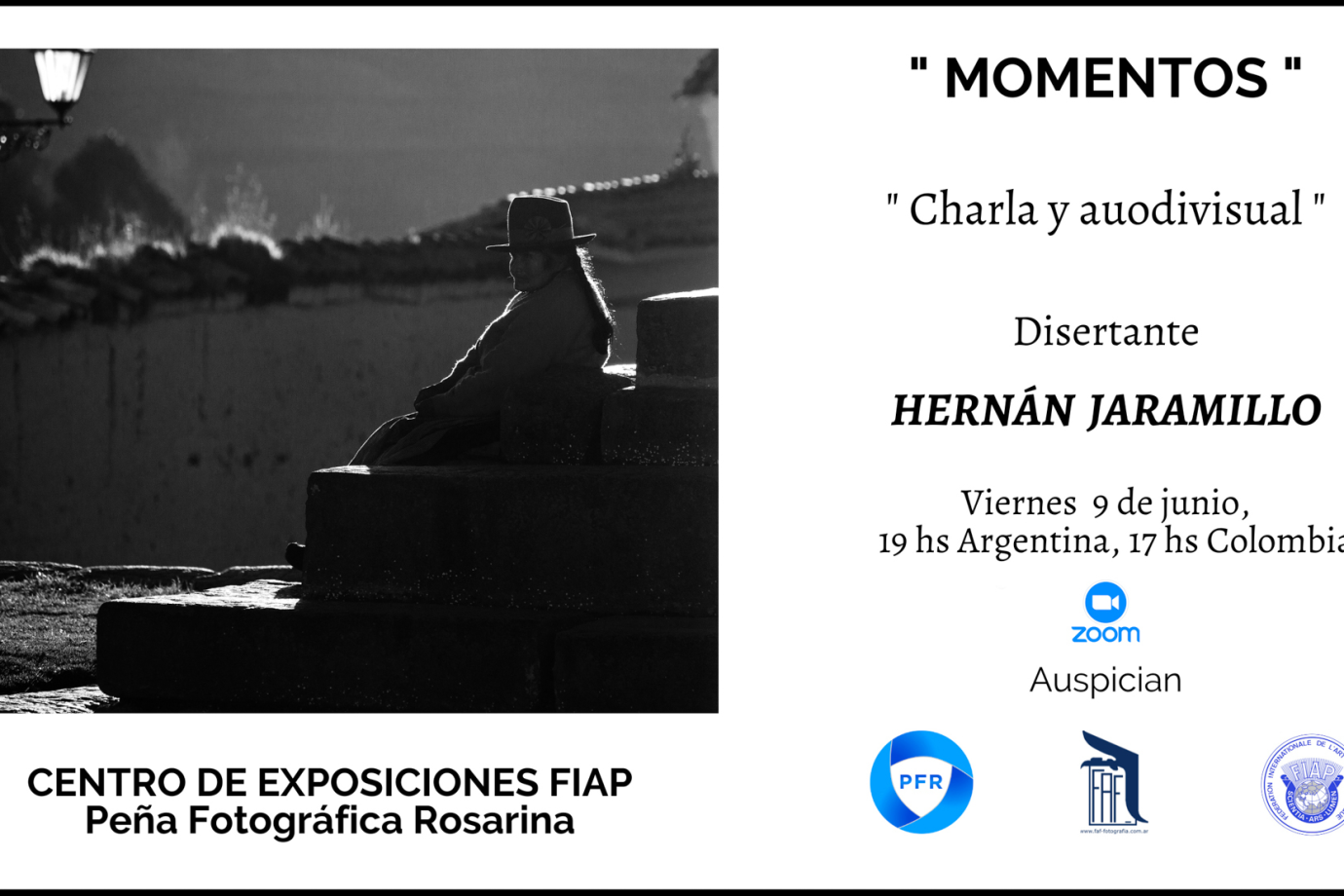 On Friday, June 9, the talk and audiovisual "Moments" by photographer Hernán Jaramillo, from Colombia, took place.Hernán was showing images and gave an explanation of the subject photographed, the compositional and technical elements in a simple way so that they are understandable, motivating them to continue growing in their photographic project.It is a presentation of images that were captured during the course of his life.Below is the information of the speaker.HERNAN JARAMILLO RAMIREZAFIAP, ESFIAPBorn in Medellin, Colombia.Business Administrator from the University of Medellín.Hobbyist photographer since 1977.He was an individual member of the International Federation of Photographic Art FIAP and currentFIAP liaison officer in Colombia.He was a member of the photographic association: “Club Cámaras”.Founder and president of the Colombian Federation of Photographic Associations (FCAF).Director of the V annual photography salon (FCAF).Currently an active member of the group "Friends of Photography" and an active participant in thephotographic communities: K5, Antioquia in photographs, Click Medellín, Medellín District,Ready for the photo.He was a member of the Medellín Photographic Club, of which he was part of its board of directors and of theEnvigado Photographic Club Association.He taught Photography and Creativity at the following institutions in Medellín:University of Medellín, Metro color, the Colombo Ibero Americano, Municipality of Medellín,Comfenalco Antioquia.Works in various committees for the benefit of photographic art, lecturer, workshops, juryin national and international events, he was an active promoter of Colombian photographyand promoter of the program "amigos latinos - americanos". Member of the organizing committeeof the FIAP biennials for Colombia, World Photographic Cup 2022, Antioquia Photographic Festival 2021 and other events.His photographs have been published in catalogues, newsletters, books, magazines and newspapers.He has participated in collective exhibitions in: Colombia, France, the United States, Belgium,Turkey, Cuba, Finland, Romania, San Marino, Taiwan, Andorra, Switzerland, Yugoslavia, Italy,India, USSR, Germany, Argentina, Australia, Japan, Ireland, UK, Spain,Guatemala, Mexico, China.He has obtained 98 prizes, recognitions and distinctions, national and international.