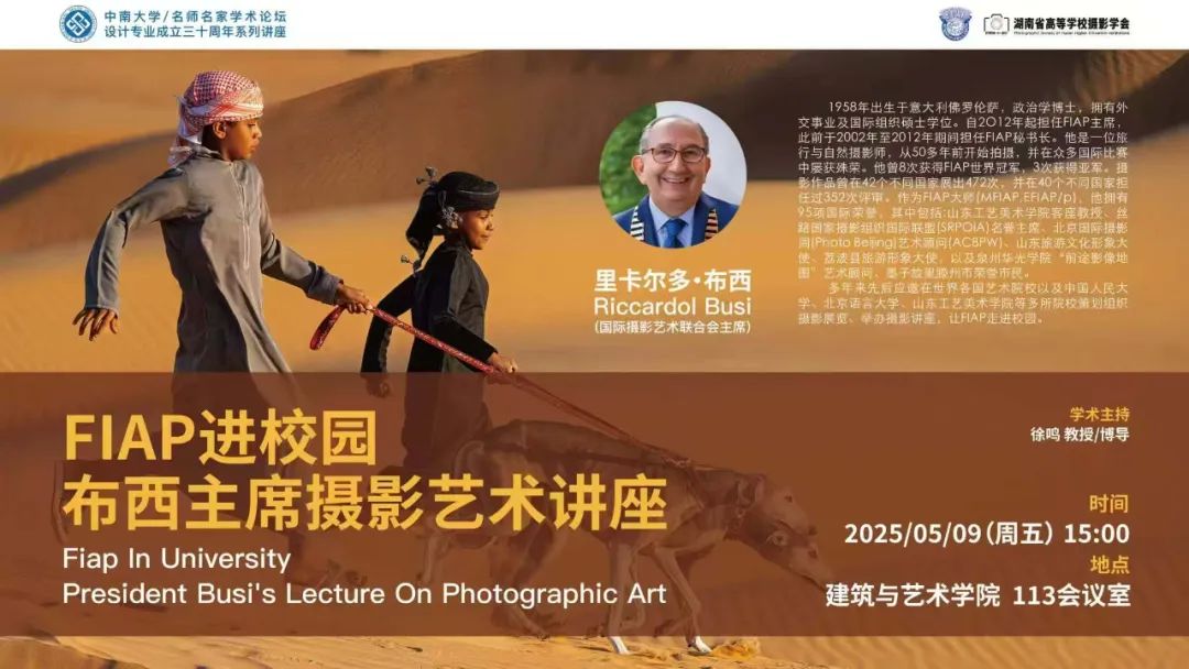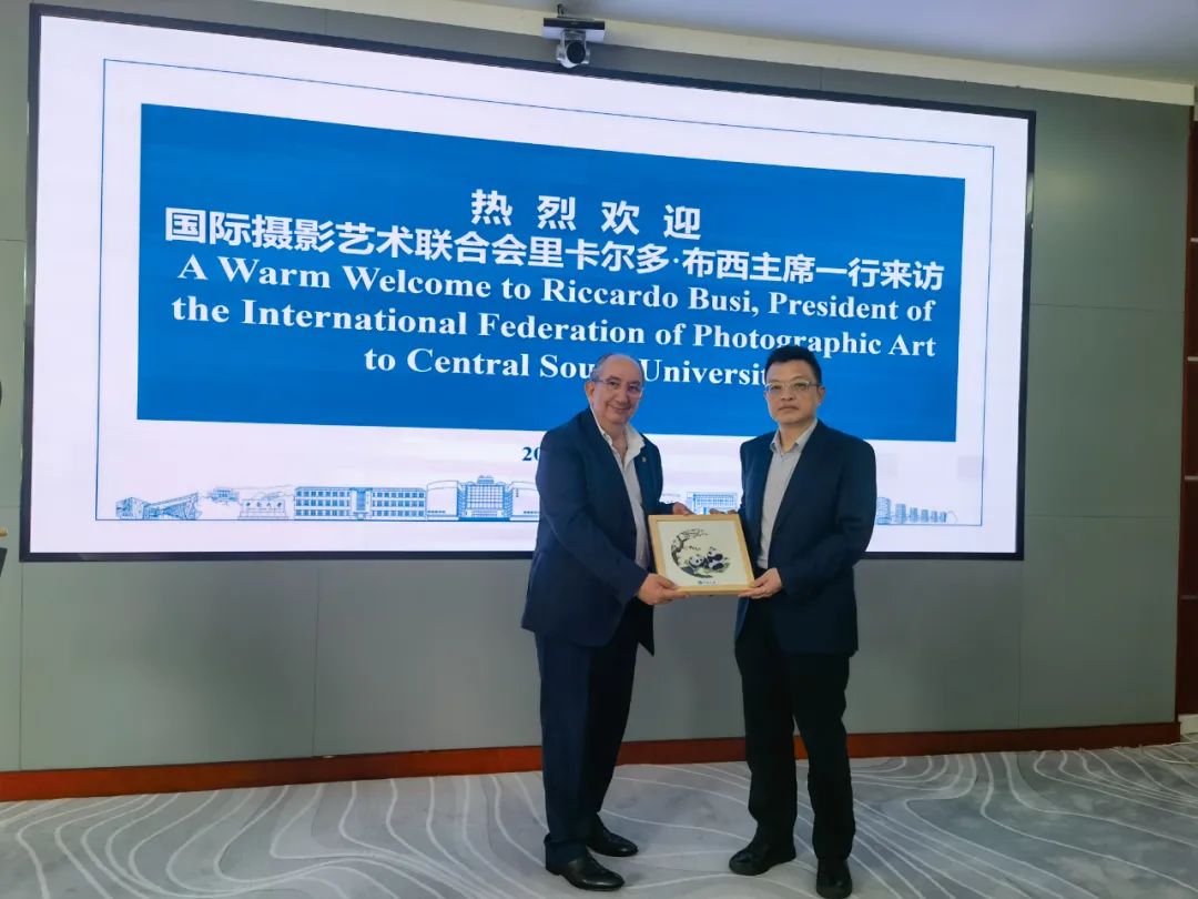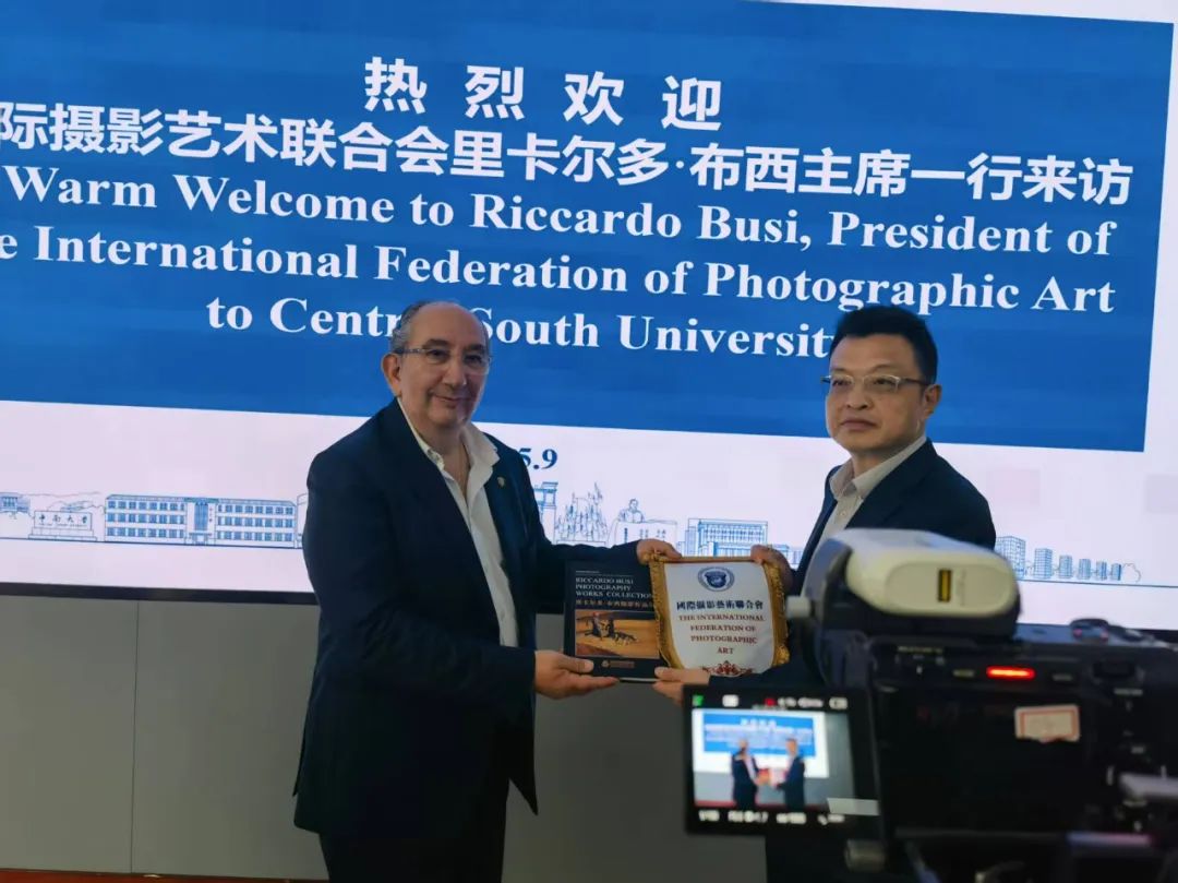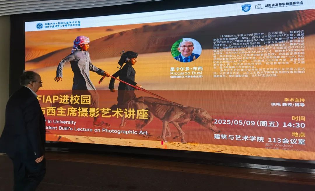 2025年5月9日,应中南大学邀请,国际摄影艺术联合会主席里卡尔多·布西一行到中南大学进行访问,并在校园里举办了《FIAP进校园:布西主席摄影艺术讲座》。