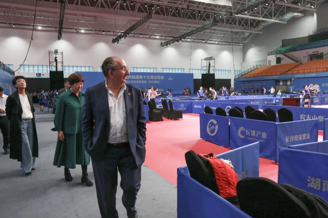 布西主席一行首先参观了刚刚落成的中南大学体育馆,时值全国第15届运动会比赛乒乓球项目(南方赛区)即将在这里举行,运动员们正在这里进行比赛前紧张的热身和训练。