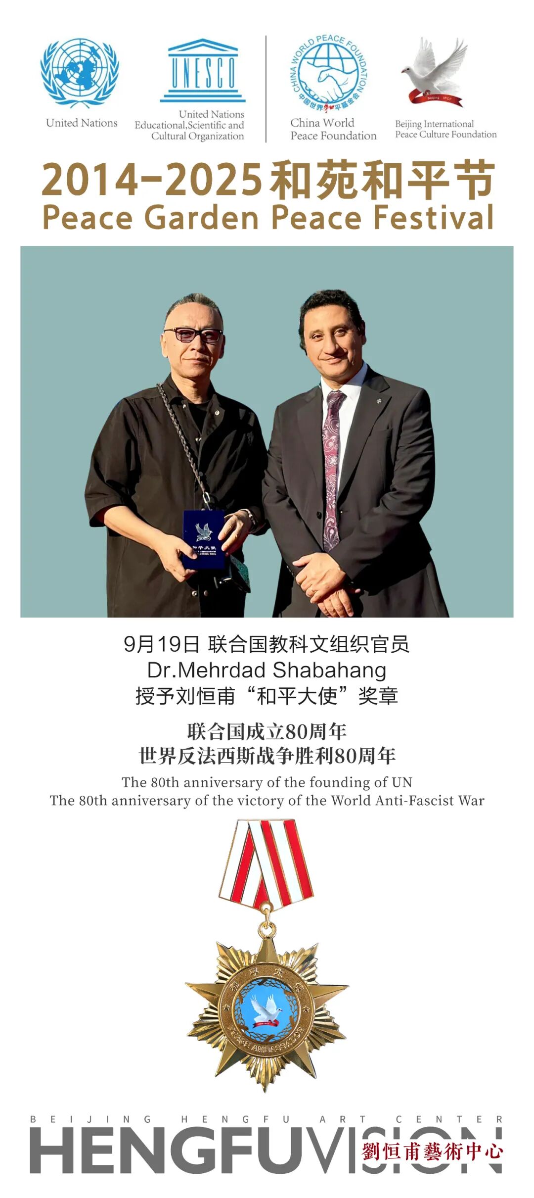 2025 年 9 月 19 日,为庆祝联合国"国际和平日",及世界反法西斯战争胜利80周年和联合国(教科文组织)成立80周年,由联合国教科文组织与中国世界和平基金会等单位共同主办的第十二届"和苑和平节"暨联合国教科文组织与北京国际和平基金会共同主办的第七届"丝绸之路青年之眼国际摄影大赛"颁奖庆典在北京和苑博物馆广场隆重举行。