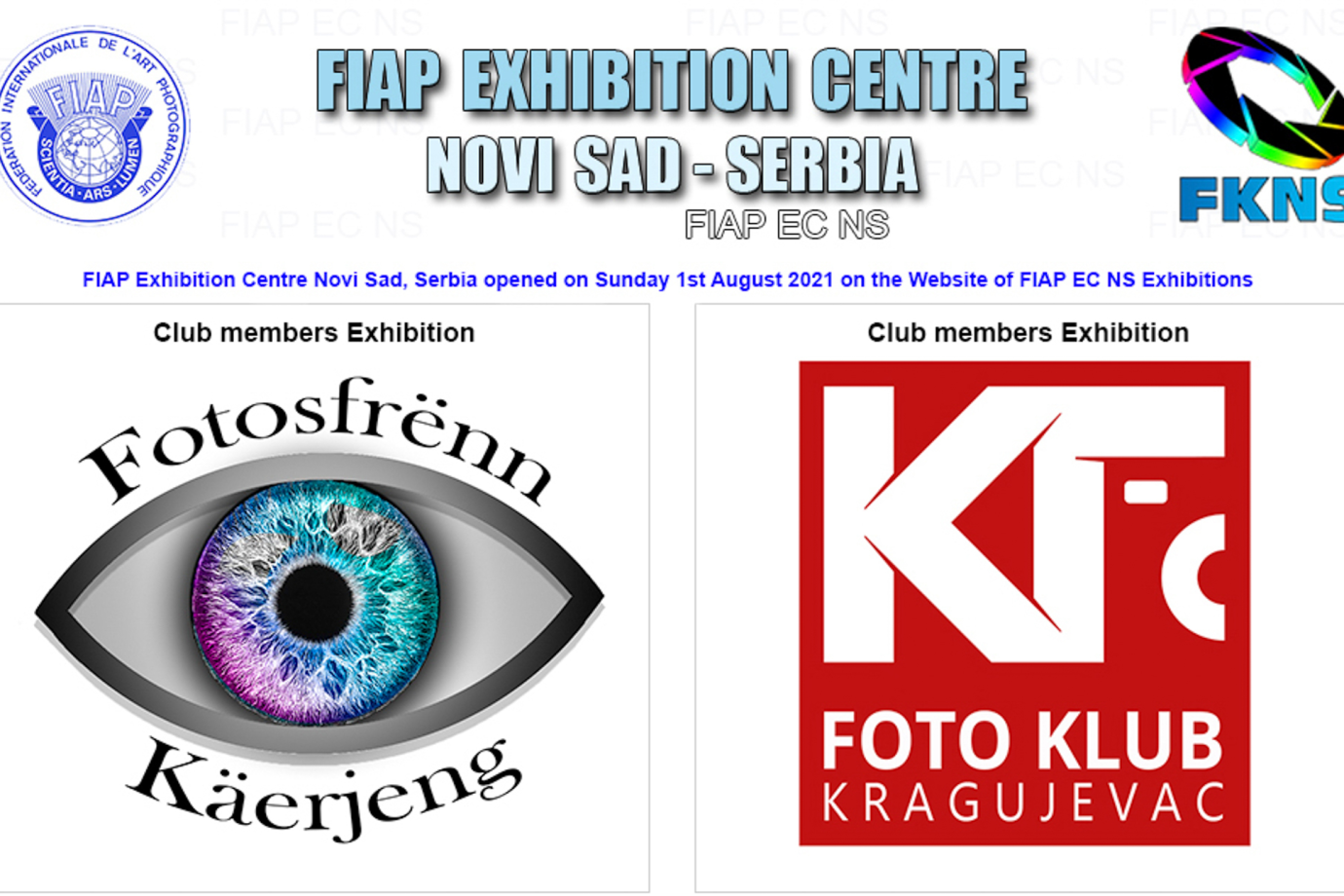 The Exhibition Centre of the Fédération Internationale de l’Art Photographique’ (FIAP) in Novi Sad, Serbia opened on Sunday 1stAugust 2021 on the Web site of FIAP EC NS https://www.fiapecns.com