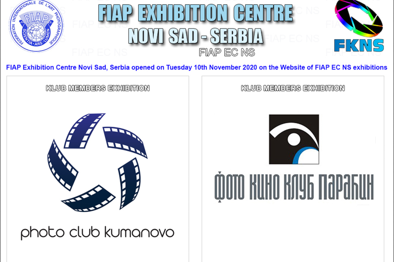 The Exhibition Centre of the Fédération Internationale de l’Art Photographique’ (FIAP) in Novi Sad, Serbia opened on Tuesday10th November 2020 on the Web site of FIAP EC NS https://www.fiapecns.com