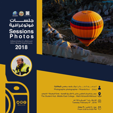 With theatmosphere of joy and celebrations, the Photographic Society of Oman, followedthe Sultan Qaboos Higher Center for Culture and Science organized Oman ForumInternational Photography that held from 3-7 February 2018. The Forum aims toenhance the artistic aspect and involves Omani photographers with adistinguished group of international photographers to show wonderful Oman in adifferent and distinct outlook.